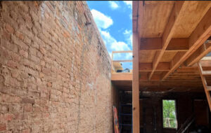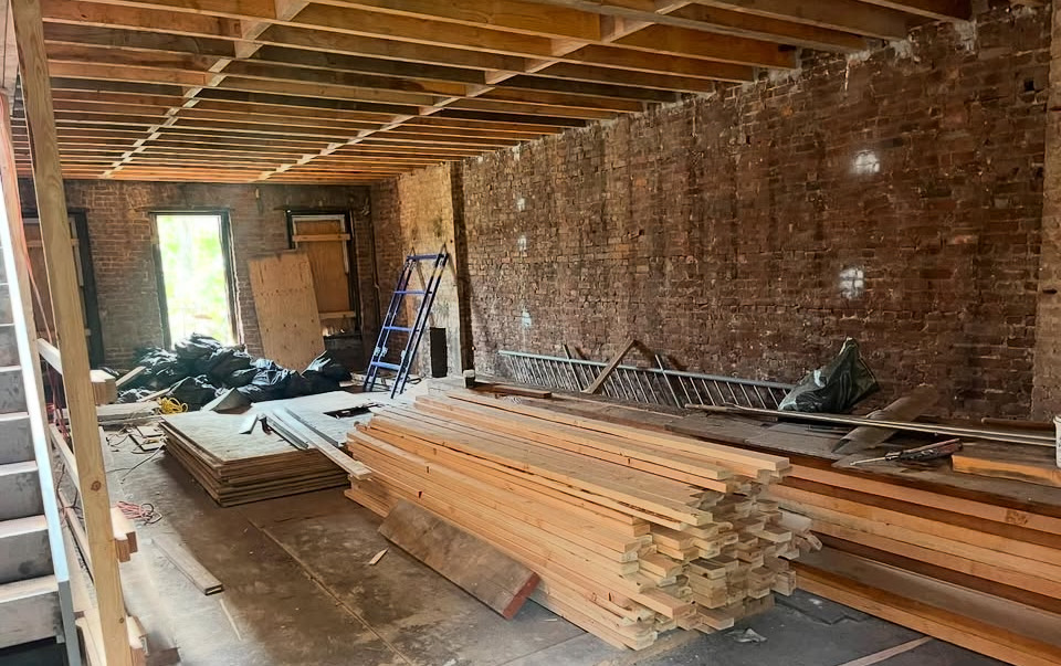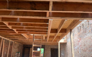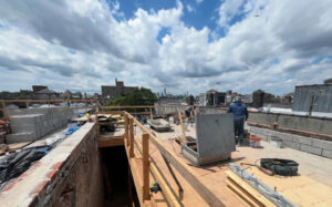 The scope of work includes installation of new drywall partitions, drop ceilings, floor joists, a new roof, and construction of a new stair bulkhead. Structural work also includes new footings and foundation to support a four-story rear extension measuring approximately 9.66 feet by 20 feet. A new heat pump system is being installed as part of the building systems upgrade.